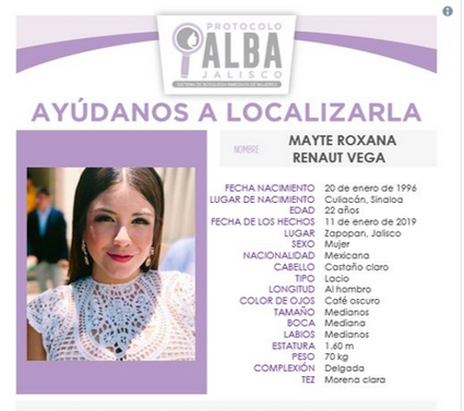 El pasado 12 de enero se reportó, en Zapopan, la desaparición de Mayte Roxana Reanut Vega, hija del ex subprocurador de Justicia de Sinaloa, Felipe Renaut Rentería. Respecto al caso, el fiscal general de Jalisco, Gerardo Octavio Solís Gómez informó que existen dos líneas de investigación “no muy sólidas”.