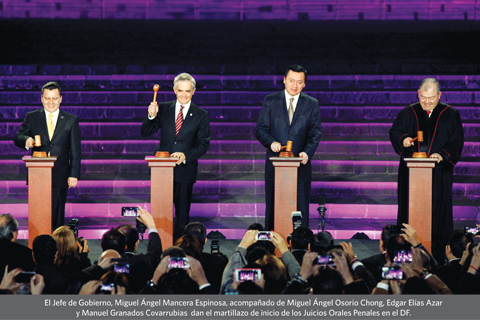 En punto de la media noche del pasado 16 de enero, la Ciudad de México se sumó al resto de las entidades en la aplicación del nuevo Sistema de Justicia Penal Acusatorio Oral. En un acto simbólico, en el Altar a la Patria en Chapultepec, el Jefe de Gobierno, Miguel Ángel Mancera Espinosa, dio el martillazo oficial para poner en marcha 40 salas dedicadas a la oralidad. Como testigos de honor lo acompañaron Miguel Ángel Osorio Chong, titular de la Secretaría de Gobernación; Edgar Elías Azar, Presidente del Tribunal Superior de Justicia capitalino (TSJDF) y Manuel Granados Covarrubias, Presidente de la Comisión de Gobierno de la ALDF.